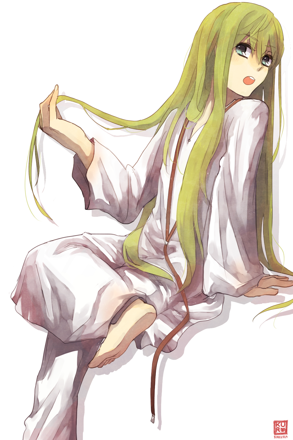 1boy androgynous barefoot enkidu_(fate) fate/strange_fake fate_(series) feet green_eyes green_hair hair_between_eyes highres kuro_sakura long_hair male_focus matching_hair/eyes open_mouth robe simple_background sitting solo trap white_background white_robe