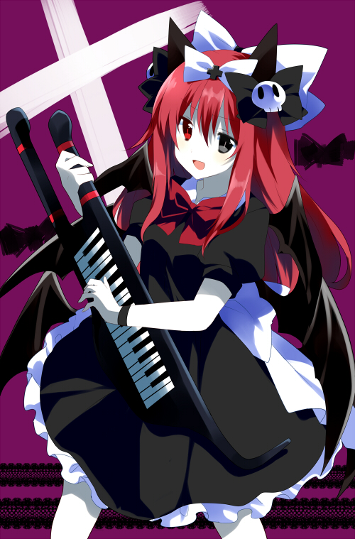 1girl bat_wings black_dress black_eyes bow dress female_focus fujishiro_emyu hair_bow hair_ribbon instrument keyboard_(instrument) long_hair multiple_wings nyanyamo open_mouth pale_skin red_eyes red_hair ribbon smile solo towelket_wo_mou_ichido wings