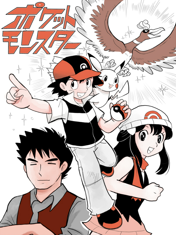 1girl 2boys ash_ketchum brock_(pokemon) child dawn_(pokemon) gen_1_pokemon gen_2_pokemon hi_no_tori ho-oh legendary_pokemon multiple_boys nintendo pikachu poke_ball pokemon pokemon_(anime) pokemon_the_series:_diamond_and_pearl retro_artstyle tagme tezuka_osamu_(style)