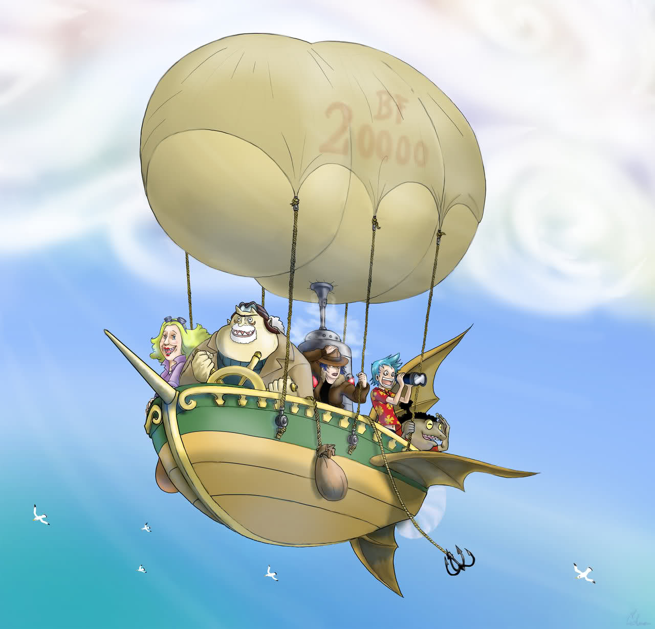 1girl 3boys aircraft airship beard black_hair blonde_hair blue_hair cutty_flam facial_hair flying franky_(one_piece) frog goggles highres iceburg jacket kokoro_(one_piece) mermaid monster_boy monster_girl multiple_boys one_piece ship tom_(one_piece) water_7 watercraft white_hair yokozuna_(one_piece)