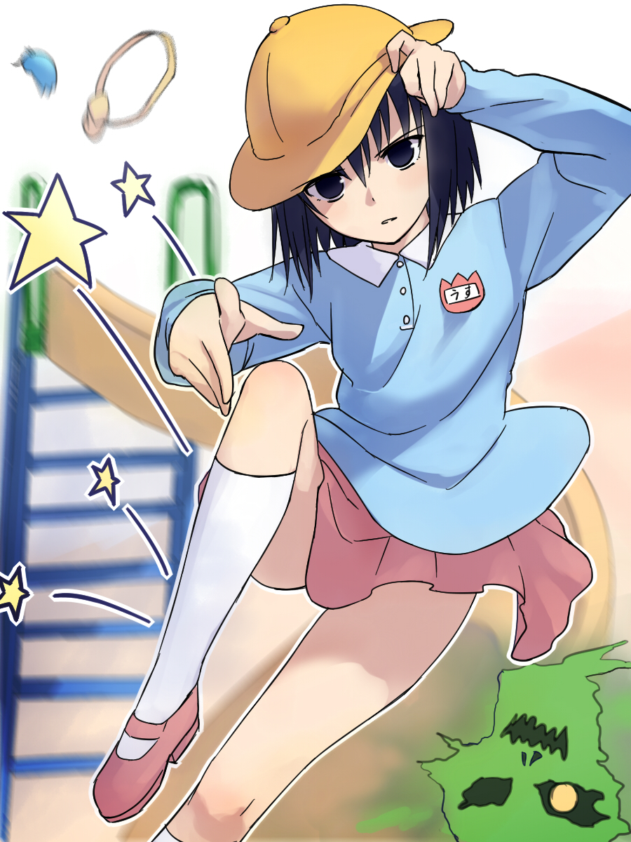 1girl black_eyes black_hair full_body hat highres kindergarten_uniform kuonji_alice level.21 mahou_tsukai_no_yoru mary_janes school_hat school_uniform shoes short_hair skirt socks type-moon