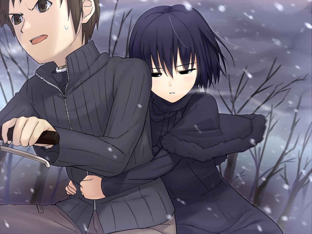 1boy 1girl black_eyes black_hair bob_cut breath brown_eyes brown_hair half-closed_eyes hetero hug hug_from_behind kuonji_alice level.21 mahou_tsukai_no_yoru open_mouth shizuki_soujuurou short_hair snowing sweat type-moon winter_clothes