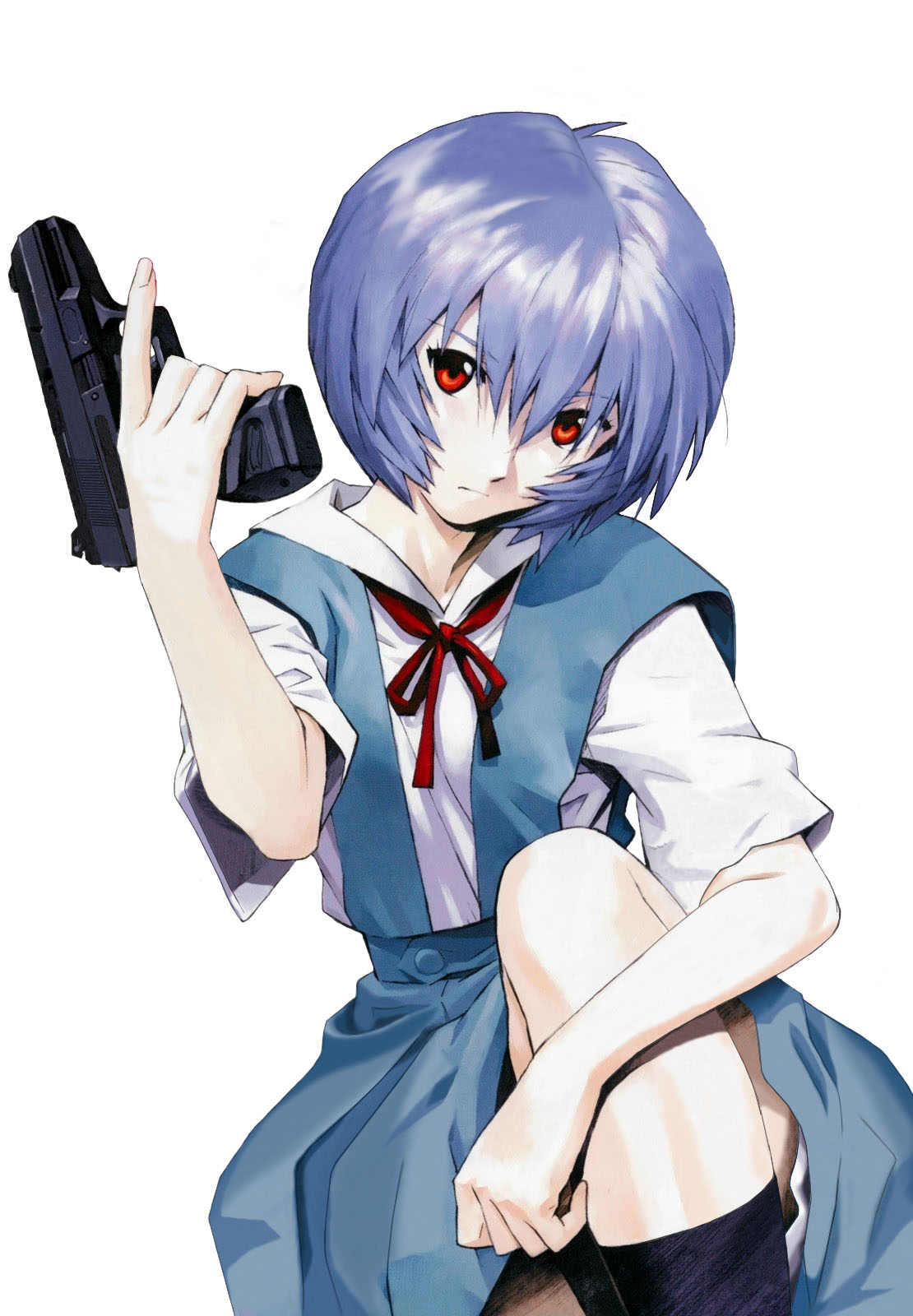 1girl ayanami_rei blue_hair female_focus gun hair_between_eyes handgun highres holding holding_gun holding_weapon looking_at_viewer neon_genesis_evangelion official_art pale_skin red_eyes sadamoto_yoshiyuki school_uniform short_hair simple_background solo trigger_discipline walther weapon white_background