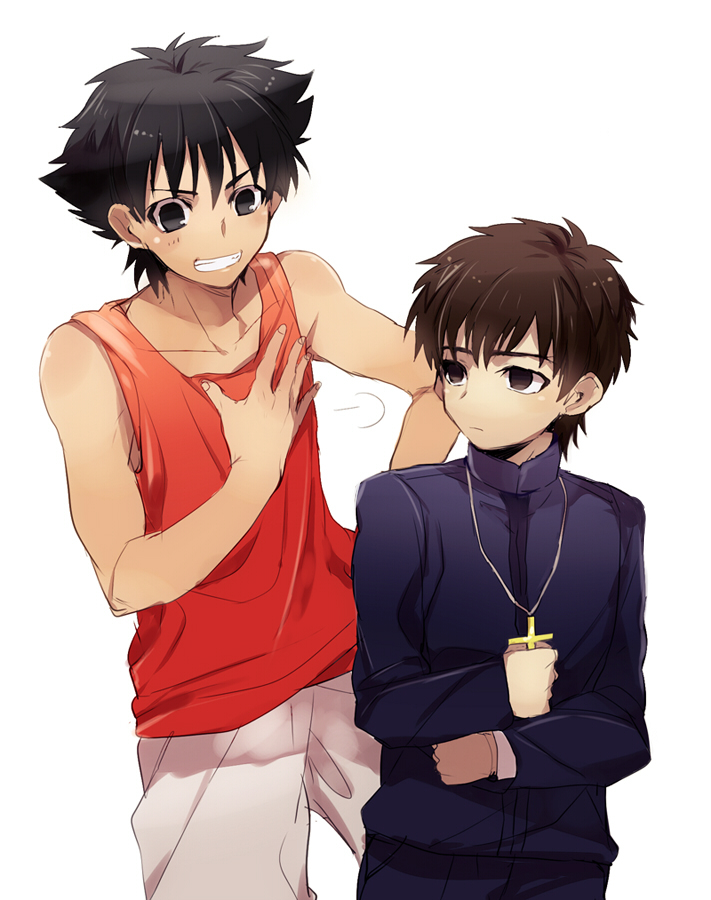 2boys aged_down amakura_(am_as) black_eyes black_hair brown_eyes brown_hair child cross cross_necklace emiya_kiritsugu fate/zero fate_(series) jewelry kotomine_kirei male_focus multiple_boys necklace tank_top time_paradox