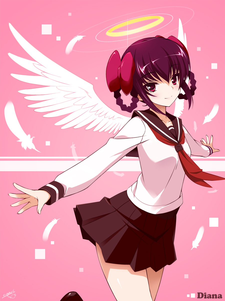 1girl angel_wings ayukawa_tenri blush bow brown_hair character_name cygnus_(cygnus7) diana_(kaminomi) feathers female_focus hair_bow hair_rings halo highres kami_nomi_zo_shiru_sekai outstretched_arms red_eyes revision school_uniform serafuku skirt smile solo spread_arms wings