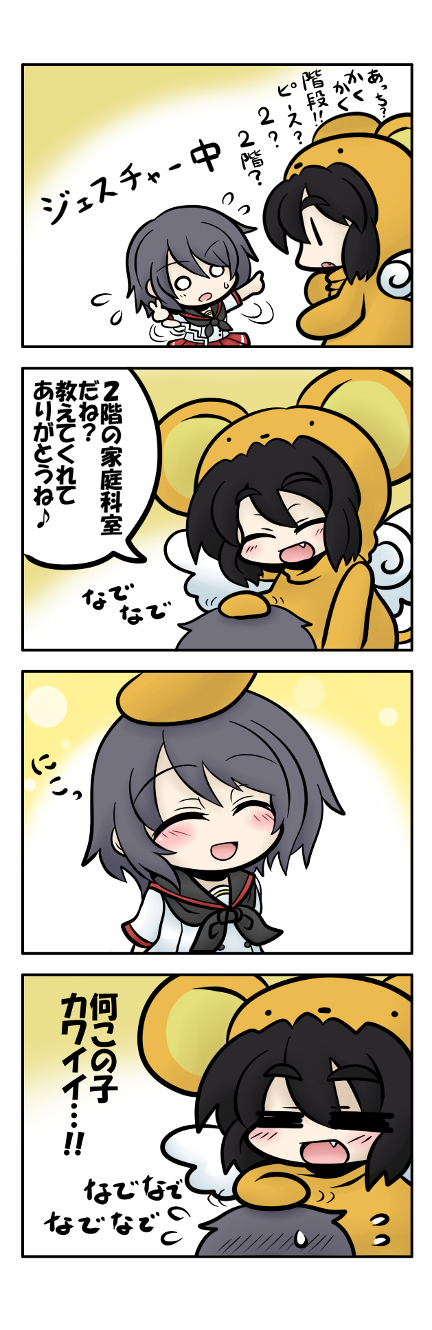 2girls 4koma =_= ^_^ black_hair cardcaptor_sakura closed_eyes comic cosplay eyebrows fang grey_hair headpat highres kero_(cardcaptor_sakura) kero_(cosplay) long_image multiple_girls o_o oono_mayu open_mouth pixiv_azriel school_uniform serafuku short_hair smile tall_image tomoeda_middle_school_uniform translation_request yanagi_(nurikoboshi) |_|