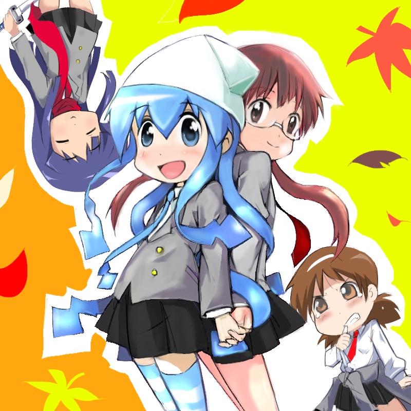 4girls aizawa_chizuru back-to-back cosplay goshiki_agiri goshiki_agiri_(cosplay) hat holding_hands ikamusume kill_me_baby long_hair multiple_girls nagatsuki_sanae oribe_yasuna oribe_yasuna_(cosplay) sakura_kiyomi scarf shinryaku!_ikamusume sonya_(kill_me_baby) sonya_(kill_me_baby)_(cosplay) striped_clothes striped_legwear striped_thighhighs sword t2 thighhighs unused_character_(cosplay) unused_character_(kill_me_baby) weapon
