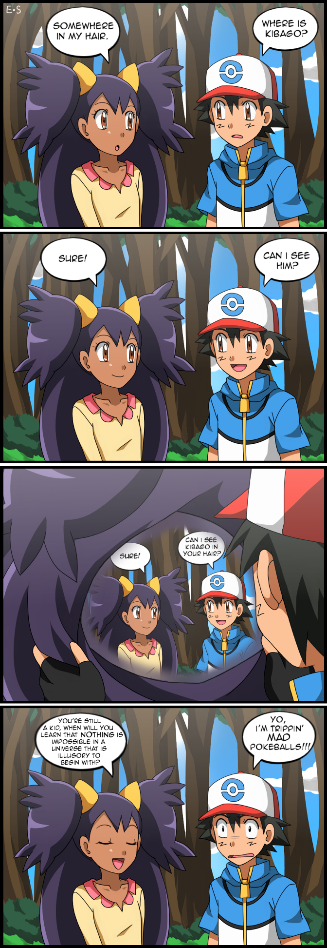 1boy 1girl ash_ketchum baseball_cap comic dark-skinned_female dark_skin endless-summer181 english_text forest hat highres iris_(pokemon) long_hair maroon_eyes meta nature nintendo pokemon pokemon_(anime) pokemon_the_series:_black_&_white purple_hair very_long_hair