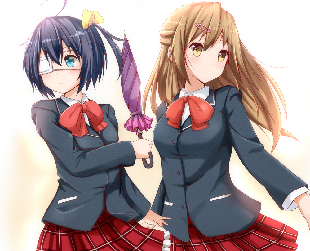 10s 2girls ahoge aqua_eyes blazer brown_hair chuunibyou_demo_koi_ga_shitai! closed_umbrella eyepatch hair_ornament hairclip half_updo jacket long_hair multiple_girls nibutani_shinka ok-ray one_side_up plaid_clothes plaid_skirt purple_hair school_uniform short_hair skirt takanashi_rikka umbrella yellow_eyes