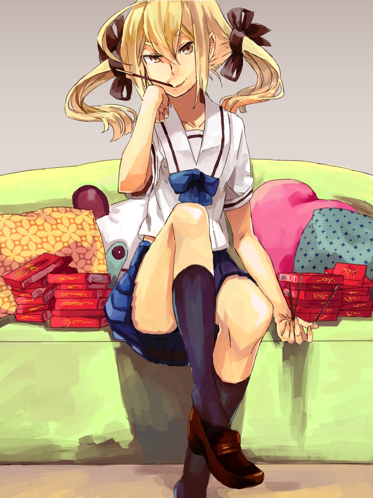10s 1girl blonde_hair female_focus food fujino_sato koujiro_frau pocky robotics;notes school_uniform science_adventure serafuku skirt socks solo twintails yellow_eyes