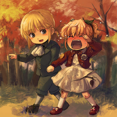 1boy 1girl aged_down androgynous ascot autumn blonde_hair child crying dress family_bonding forest formal_clothes furutachirikonbu grey_eyes holding_hands leaf leaf_on_head lowres nature object_on_head open_mouth pointing ponytail siblings tears umineko_no_naku_koro_ni ushiromiya_jessica ushiromiya_lion white_legwear