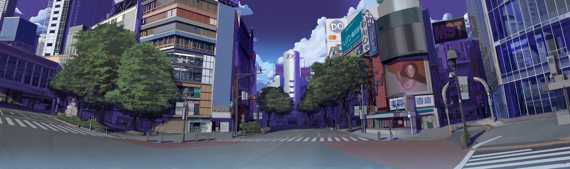 building city crosswalk highres japan lamppost long_image no_humans real_world_location scenery shibuya_(tokyo) shibuya_109 sign tactile_paving teirumon tokyo_(city) traffic_light tree wide_image