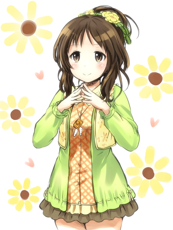 10s 1girl bad_id bad_pixiv_id blush brown_hair female_focus fingers_together idolmaster idolmaster_cinderella_girls jewelry necklace ponytail poponpin skirt smile solo steepled_fingers takamori_aiko