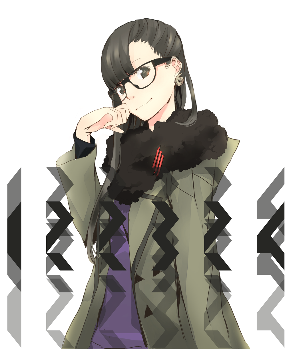 1girl bad_id bad_pixiv_id black_hair coat cosplay earrings female_focus glasses grey_eyes highres jewelry kashiyuka looking_at_viewer perfume_(band) simple_background skrillex skrillex_(cosplay) smile solo upper_body white_background yoshito