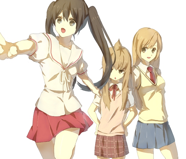 00s 3girls ahoge bad_id bad_pixiv_id brown_eyes brown_hair emi_(emi43) minami-ke minami_chiaki minami_haruka minami_kana multiple_girls school_uniform serafuku simple_background standing white_background