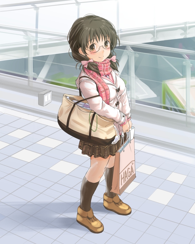 10s 1girl asano_fuka bad_id bad_pixiv_id bag black_socks blush bow brown_eyes brown_hair female_focus full_body glasses hair_bow handbag holding idolmaster idolmaster_cinderella_girls kneehighs looking_at_viewer low_twintails plaid_clothes plaid_scarf pleated_skirt poponpin scarf short_hair skirt smile socks solo standing twintails