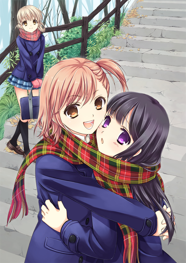 3girls bad_id bad_pixiv_id black_hair black_legwear blazer blonde_hair blush brown_hair hug jacket long_hair looking_at_viewer multiple_girls ooshima_towa open_mouth original plaid_clothes plaid_scarf plaid_skirt purple_eyes red_scarf scarf school_uniform shared_clothes shared_scarf short_hair skirt standing
