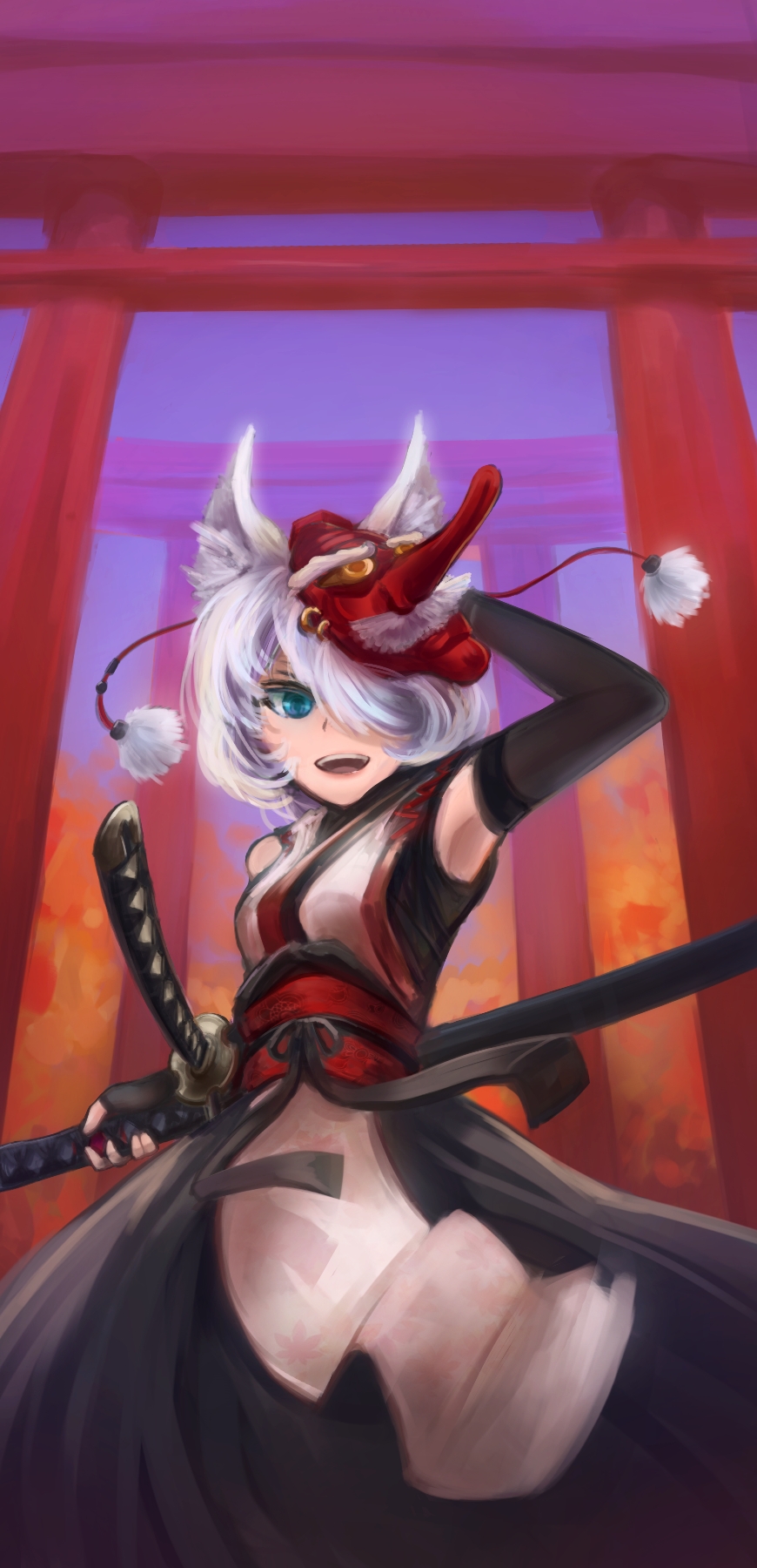 1girl alternate_costume alternate_eye_color animal_ears arceonn armpits blue_eyes elbow_gloves female_focus fingerless_gloves gloves hair_over_one_eye hakama hakama_skirt hat highres inubashiri_momiji japanese_clothes katana mask open_mouth parted_bangs scabbard sheath sheathed short_hair skirt sleeveless solo sword tassel tengu_mask tokin_hat torii touhou weapon white_hair wolf_ears