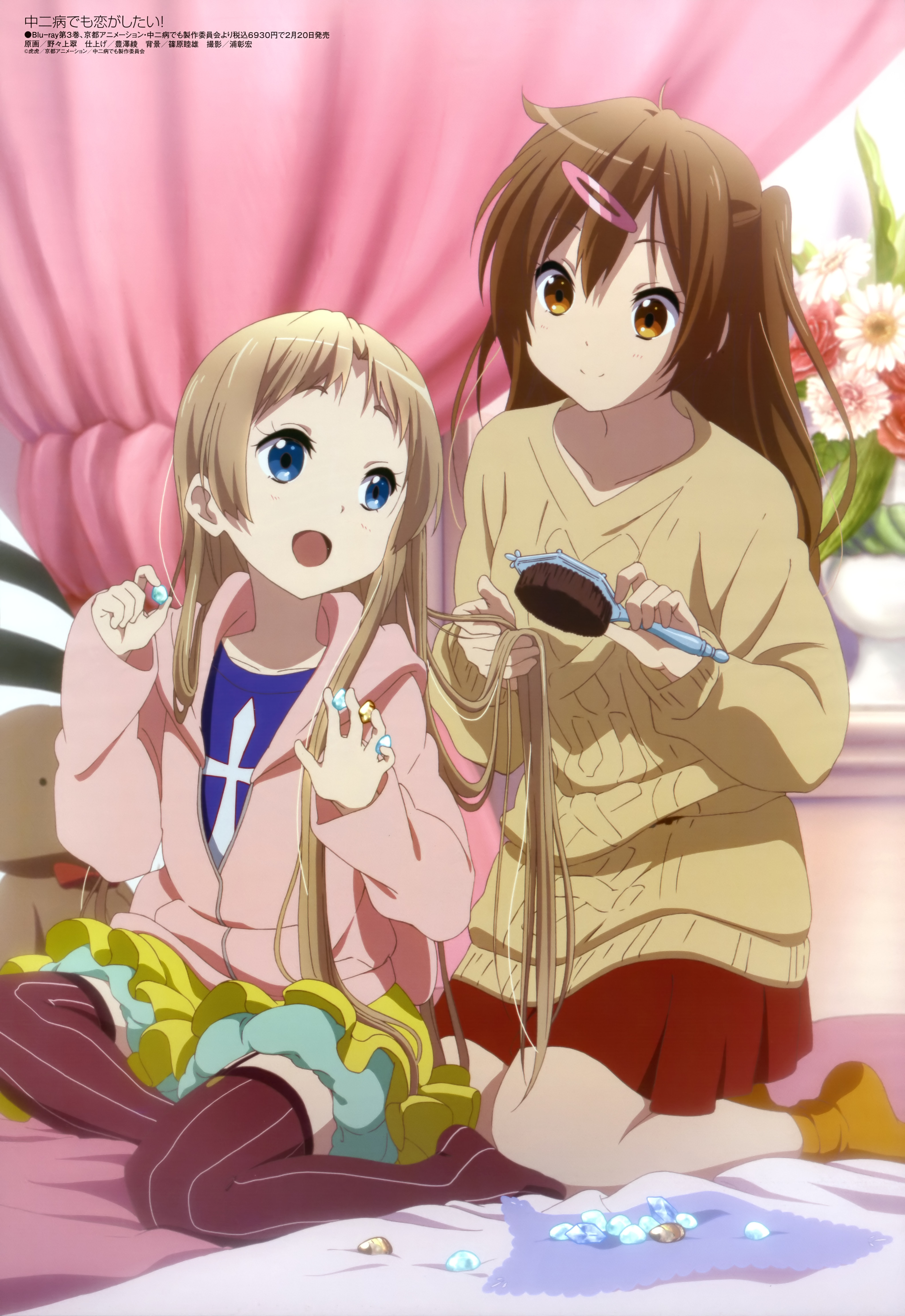 10s 2girls :d absurdres alternate_hairstyle blonde_hair blue_eyes brown_eyes brown_hair casual chuunibyou_demo_koi_ga_shitai! curtains dekomori_sanae feet flower garter_straps gem hair_brush hair_down hair_ornament hairclip highres hood hoodie kneeling legs long_hair megami_magazine multiple_girls nibutani_shinka no_shoes non-web_source nonoue_midori official_art one_side_up open_mouth palms pinstripe_pattern skirt smile socks striped_clothes striped_legwear striped_thighhighs sweater thighhighs vertical-striped_clothes vertical-striped_legwear vertical-striped_thighhighs very_long_hair zettai_ryouiki