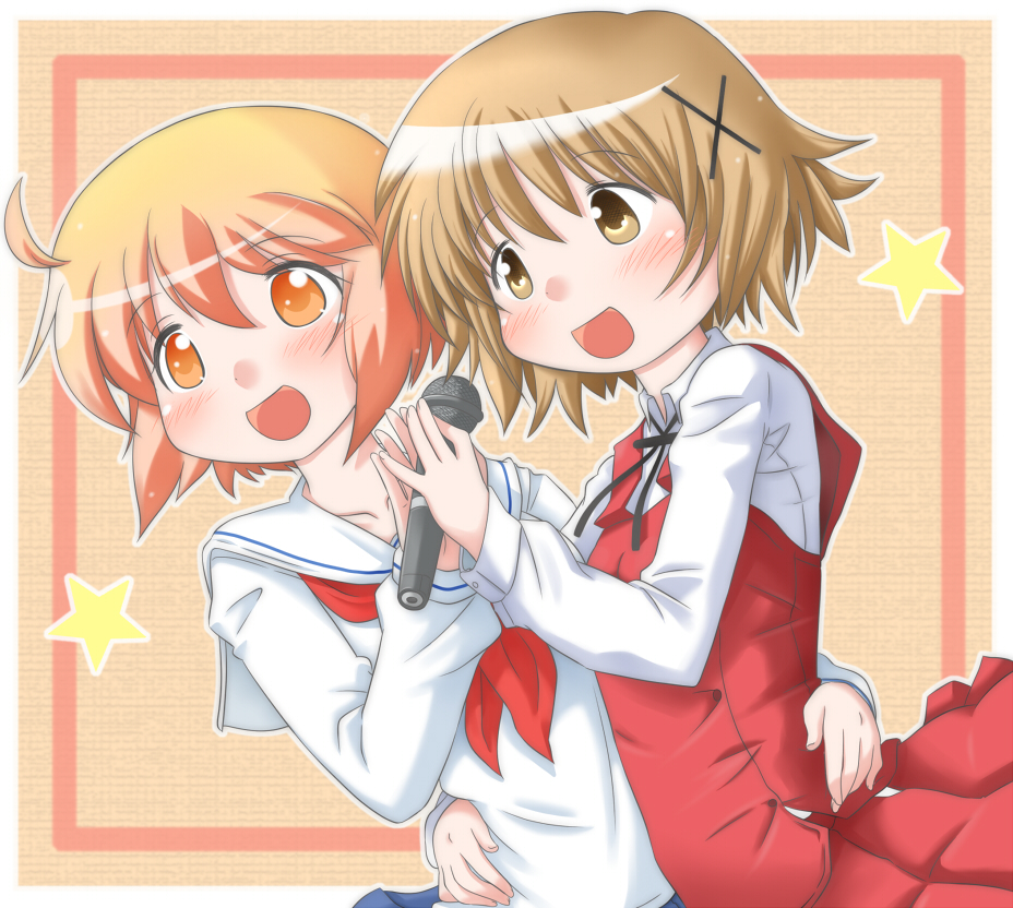 10s 2girls ahoge blush brown_eyes brown_hair crossover hair_ornament hidamari_sketch jack_(slaintheva) kotoura-san kotoura_haruka microphone multiple_girls open_mouth orange_eyes orange_hair school_uniform serafuku short_hair trait_connection yamabuki_high_school_uniform yuno_(hidamari_sketch)