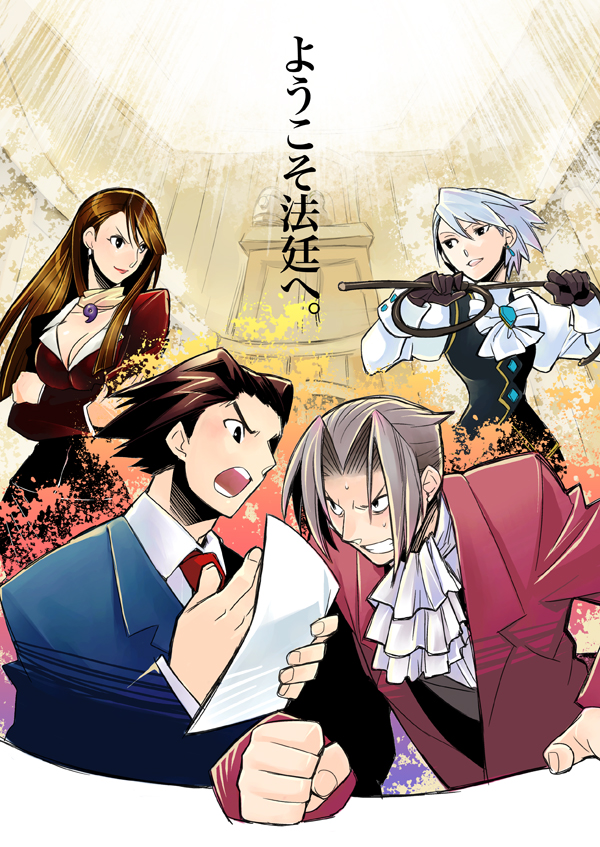 2boys 2girls angry mia_fey black_eyes brown_hair capcom clenched_hand clenched_teeth ascot formal_clothes gloves ace_attorney franziska_von_karma long_hair magatama miles_edgeworth multiple_boys multiple_girls phoenix_wright necktie paper short_hair smile suit sweat teeth tydk whip white_hair