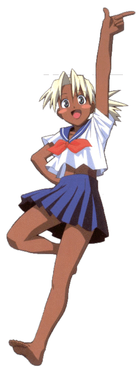 1girl barefoot blonde_hair blush_stickers dark-skinned_female dark_skin flat_chest kaolla_su love_hina open_mouth sailor_collar school_uniform standing standing_on_one_leg toes