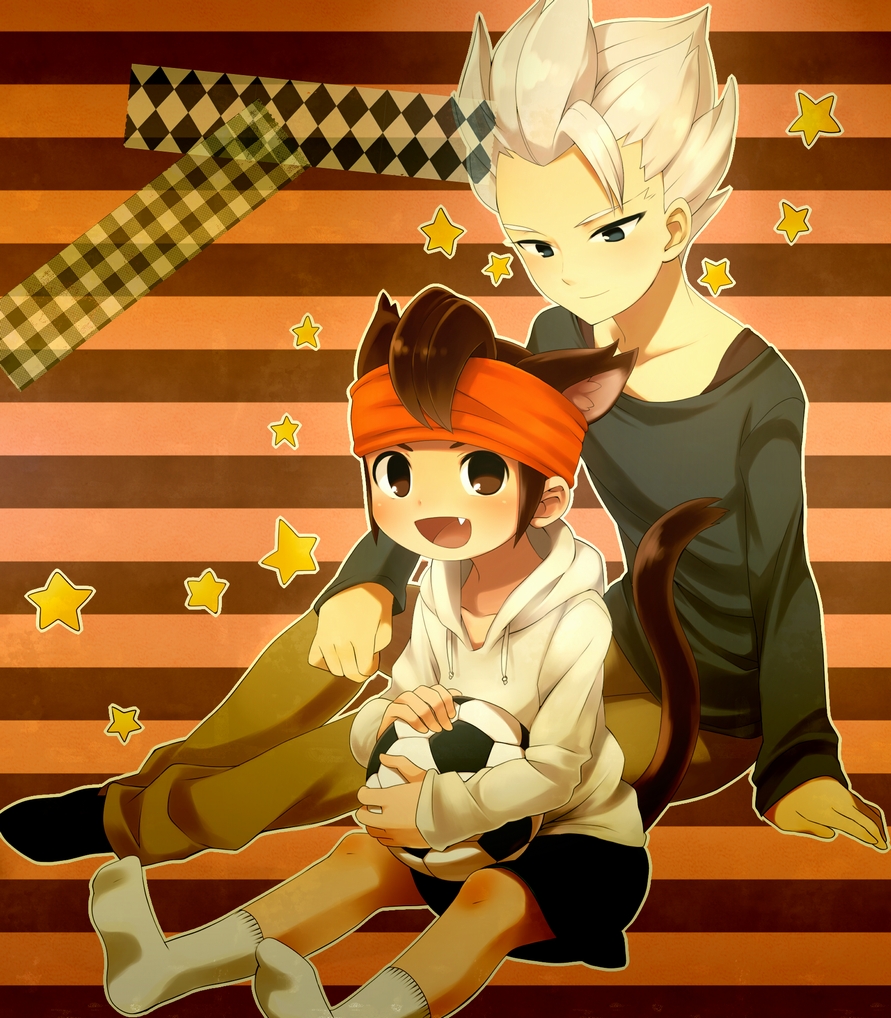 2boys animal_ears bad_id bad_pixiv_id blue_eyes brown_eyes brown_hair cat_boy cat_ears cat_tail endou_mamoru fang full_body gouenji_shuuya headband hood hoodie inazuma_eleven inazuma_eleven_(series) male_focus multiple_boys open_mouth shiorinda smile socks star_(symbol) tail white_hair