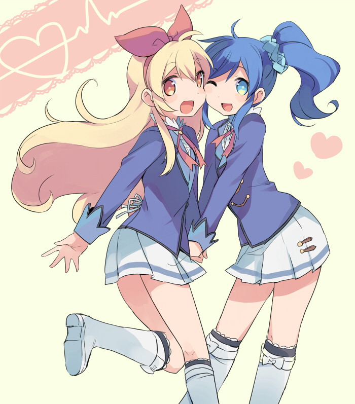 10s 2girls :d ;d aikatsu! aikatsu!_(series) bad_id bad_pixiv_id black_legwear blazer blonde_hair blue_eyes blue_hair blush boots cheek-to-cheek hair_ribbon heads_together heart holding hoshimiya_ichigo jacket kiriya_aoi long_hair mizuki_(koko_lost) multiple_girls one_eye_closed open_mouth orange_eyes parted_bangs pleated_skirt ponytail ribbon school_uniform scrunchie side_ponytail sidelocks skirt smile socks swept_bangs white_background white_footwear yellow_eyes