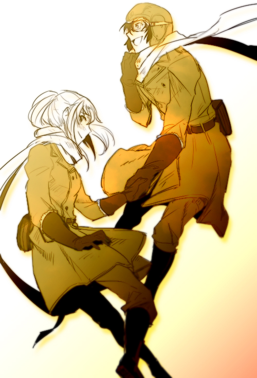 1boy 1girl gloves goggles headgear hetero holding_hands hyoubu_kyousuke long_coat long_hair matsuya29 monochrome scarf sepia short_hair smile tsubomi_fujiko zettai_karen_children