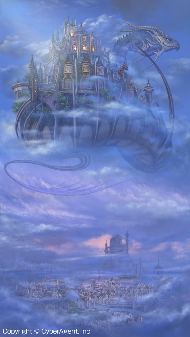 bad_id bad_pixiv_id blue_theme building castle cityscape cloud dragon floating kazumasa_uchio no_humans river scenery sky tenkuu_no_crystalia uchio_kazumasa