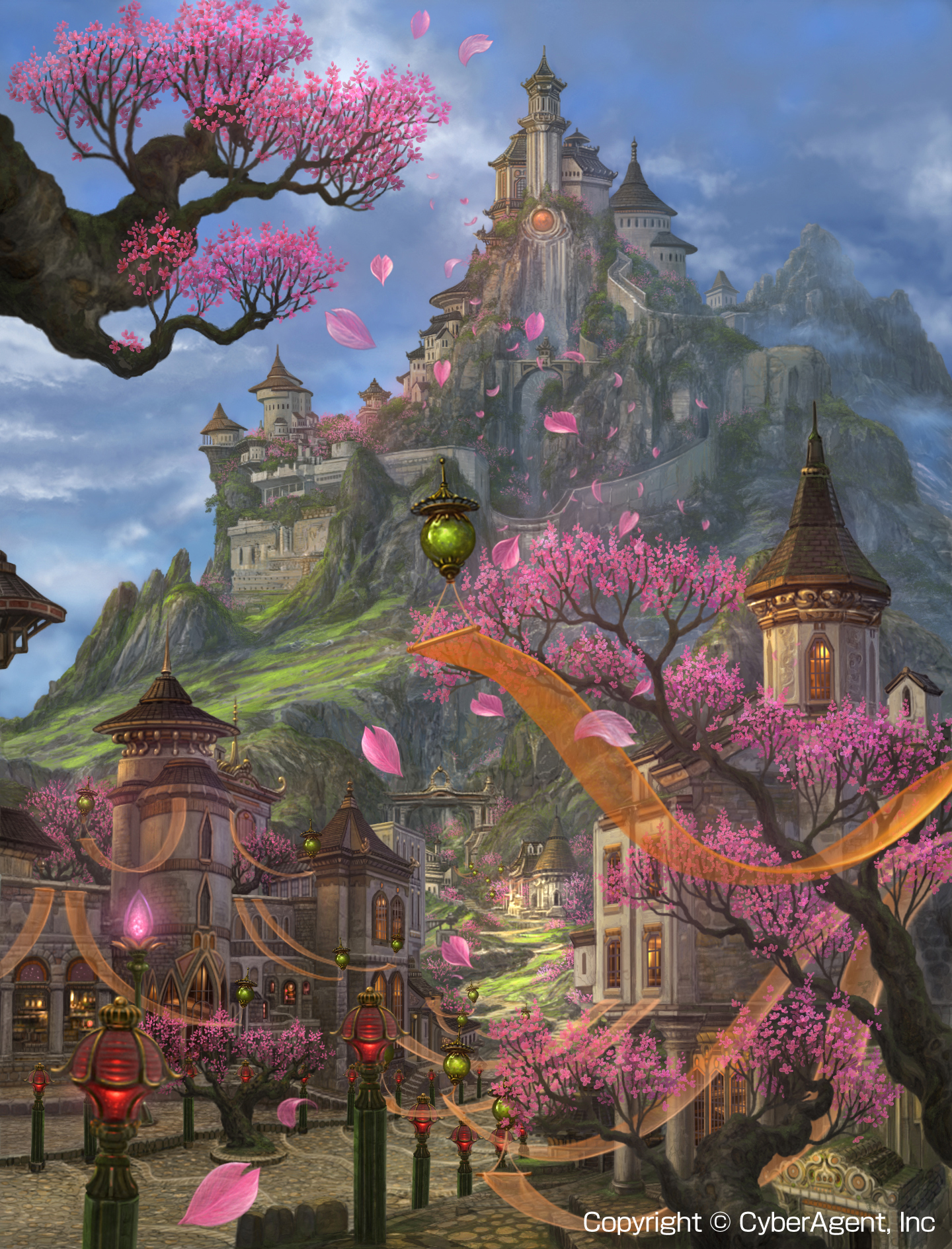castle cherry_blossoms highres kazumasa_uchio lantern mountain no_humans petals scenery stairs tenkuu_no_crystalia uchio_kazumasa water waterfall