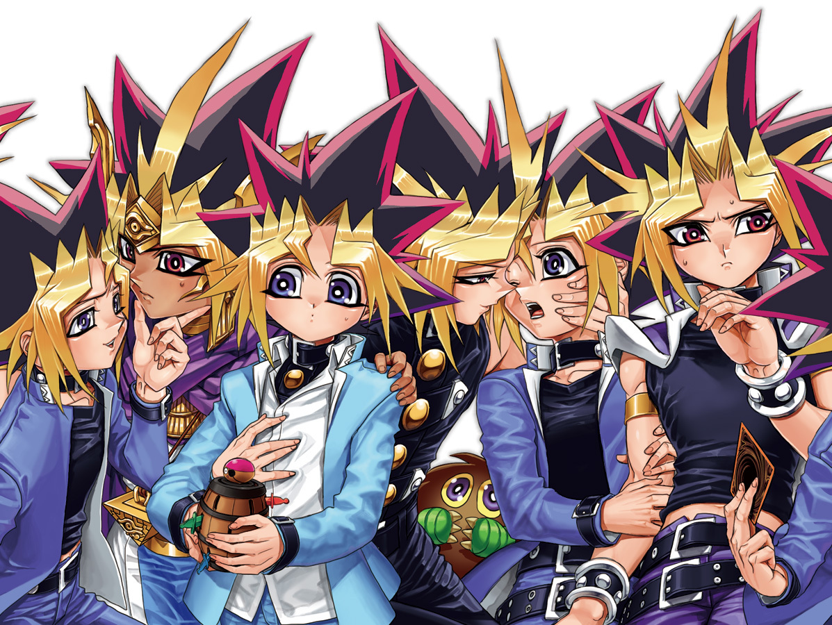 2boys atem blonde_hair blue_eyes blush card duel_monster colored_bangs gakuran half-closed_eyes hari_(quartzshow) imminent_kiss kuriboh male_focus multicolored_hair multiple_boys muto_yugi open_mouth pink_hair quartzshow red_eyes school_uniform spiked_hair sweat two-tone_hair wince yami_yugi yaoi yu-gi-oh! yu-gi-oh!_duel_monsters