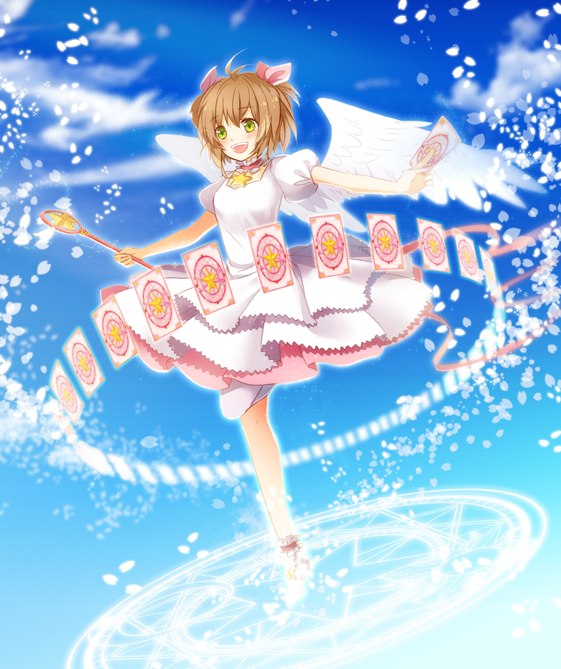 1990s_(style) 1girl brown_hair card cardcaptor_sakura cc_(peggy150121) dress full_body green_eyes hoshi_no_tsue kinomoto_sakura kinomoto_sakura_(astral_sakura) magic_circle magical_girl on_magic_circle retro_artstyle sakura_card short_hair standing standing_on_magic_circle wand wings