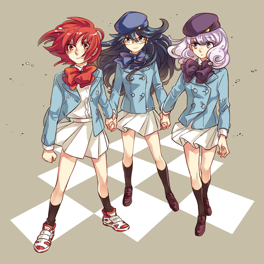 3girls akashi_kaoru beret black_hair blue_eyes emi_(10-rankai) glasses hat holding_hands long_hair long_sleeves multiple_girls nogami_aoi purple_eyes purple_hair red_eyes red_hair sannomiya_shiho shoes short_hair skirt sneakers socks uniform zettai_karen_children