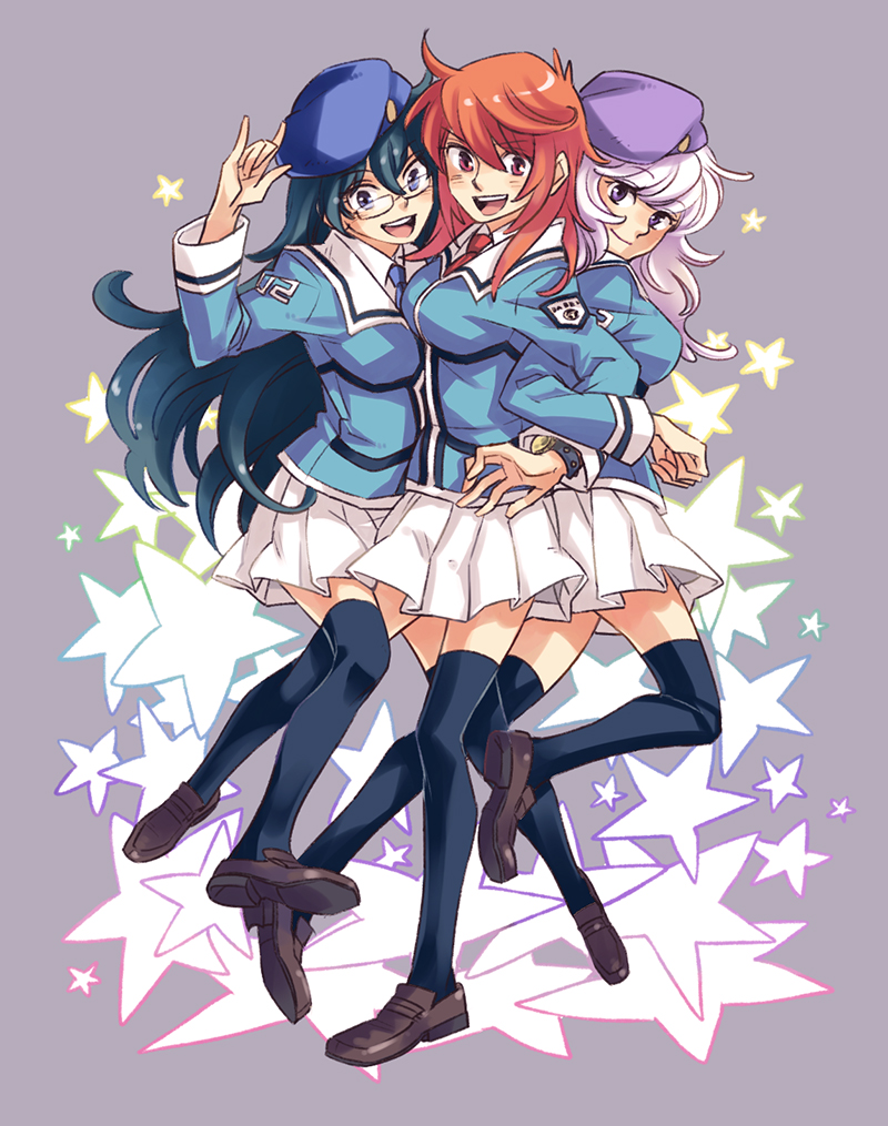 3girls akashi_kaoru beret black_hair black_legwear blue_eyes blush bracelet emi_(10-rankai) glasses grey_background hat jewelry long_hair long_sleeves multiple_girls nogami_aoi open_mouth purple_eyes purple_hair red_eyes red_hair sannomiya_shiho shoes skirt star_(symbol) teeth thighhighs uniform zettai_karen_children