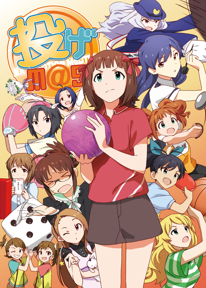 6+girls akizuki_ritsuko amami_haruka ball baseball_glove basketball basketball_(object) black_hair blonde_hair blush bouquet bowling bowling_ball brown_eyes brown_hair dani-ikapi dart dice dress flower frisbee futami_ami futami_mami ganaha_hibiki glasses green_eyes hagiwara_yukiho hoshii_miki idolmaster idolmaster_(classic) kikuchi_makoto kisaragi_chihaya ladle long_hair minase_iori miura_azusa multiple_girls one_eye_closed open_mouth police police_uniform polo_shirt postcard red_eyes shirt short_hair siblings silver_hair sisters skirt spoon striped_clothes striped_shirt takatsuki_yayoi twins wedding_dress wink