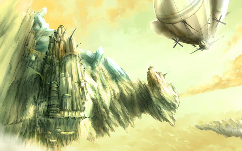 aircraft airship bad_id bad_pixiv_id castle cliff cloud coz_(commit) dirigible flying landscape no_humans reflection scenery sky water