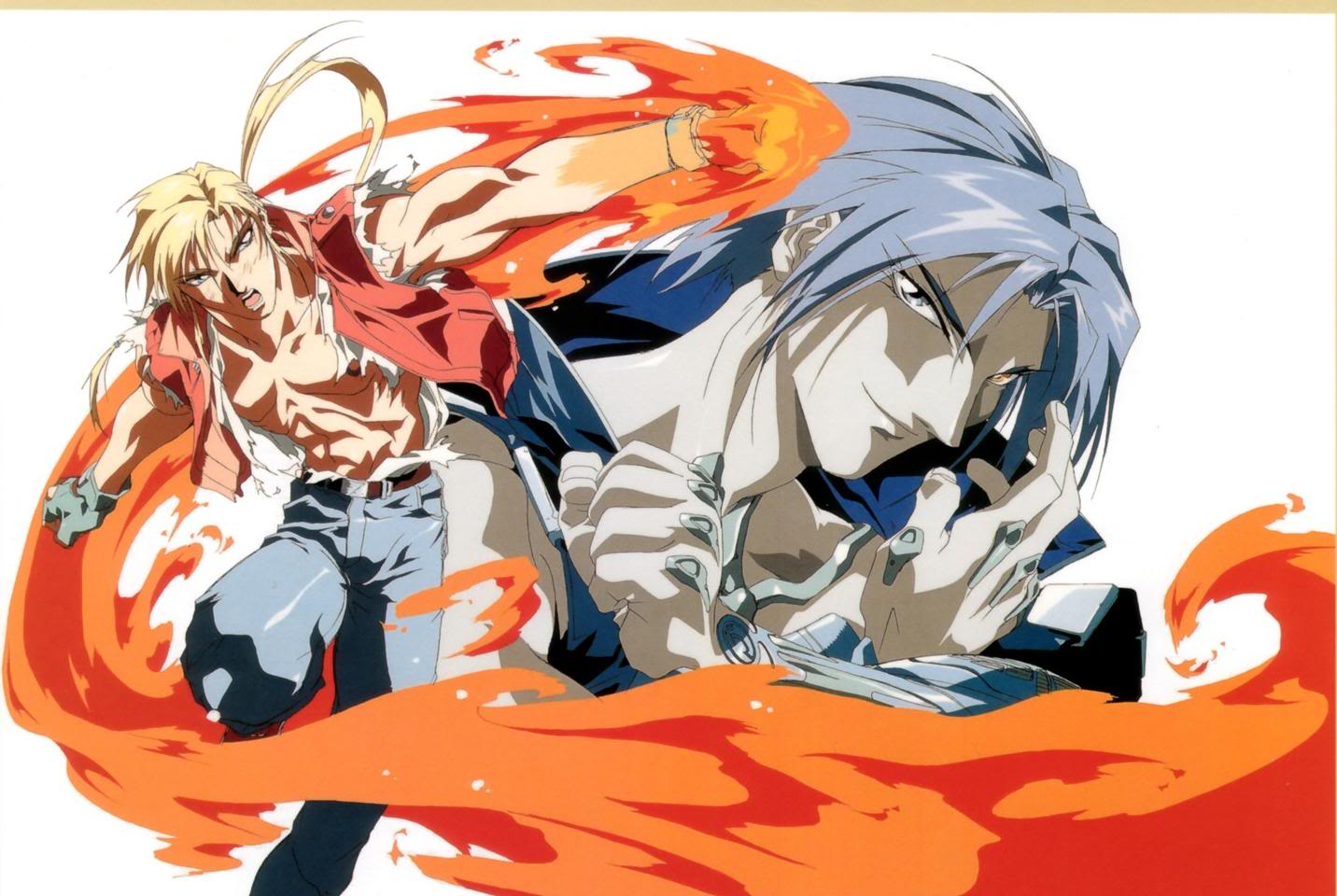 1990s_(style) 2boys battle blonde_hair fatal_fury fatal_fury:_the_motion_picture fighting grey_hair laocorn_gaudeamus male_focus multiple_boys muscular muscular_male official_art oobari_masami retro_artstyle shirt snk terry_bogard torn_clothes torn_shirt