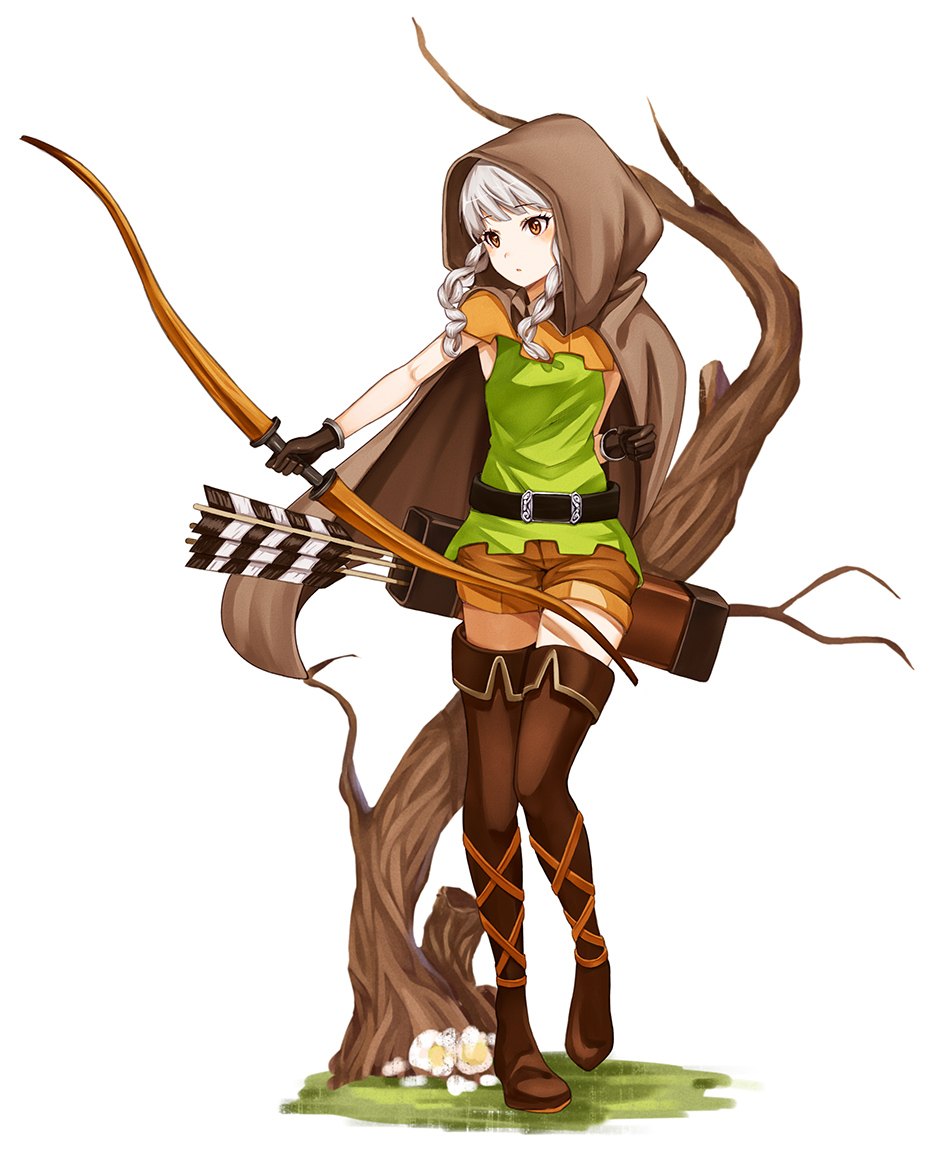 1girl arrow_(projectile) belt blush boots bow_(weapon) braid brown_eyes cloak dragon's_crown elf elf_(dragon's_crown) female_focus gloves hood long_hair pointy_ears purea shorts silver_hair solo thigh_boots thighhighs twin_braids weapon