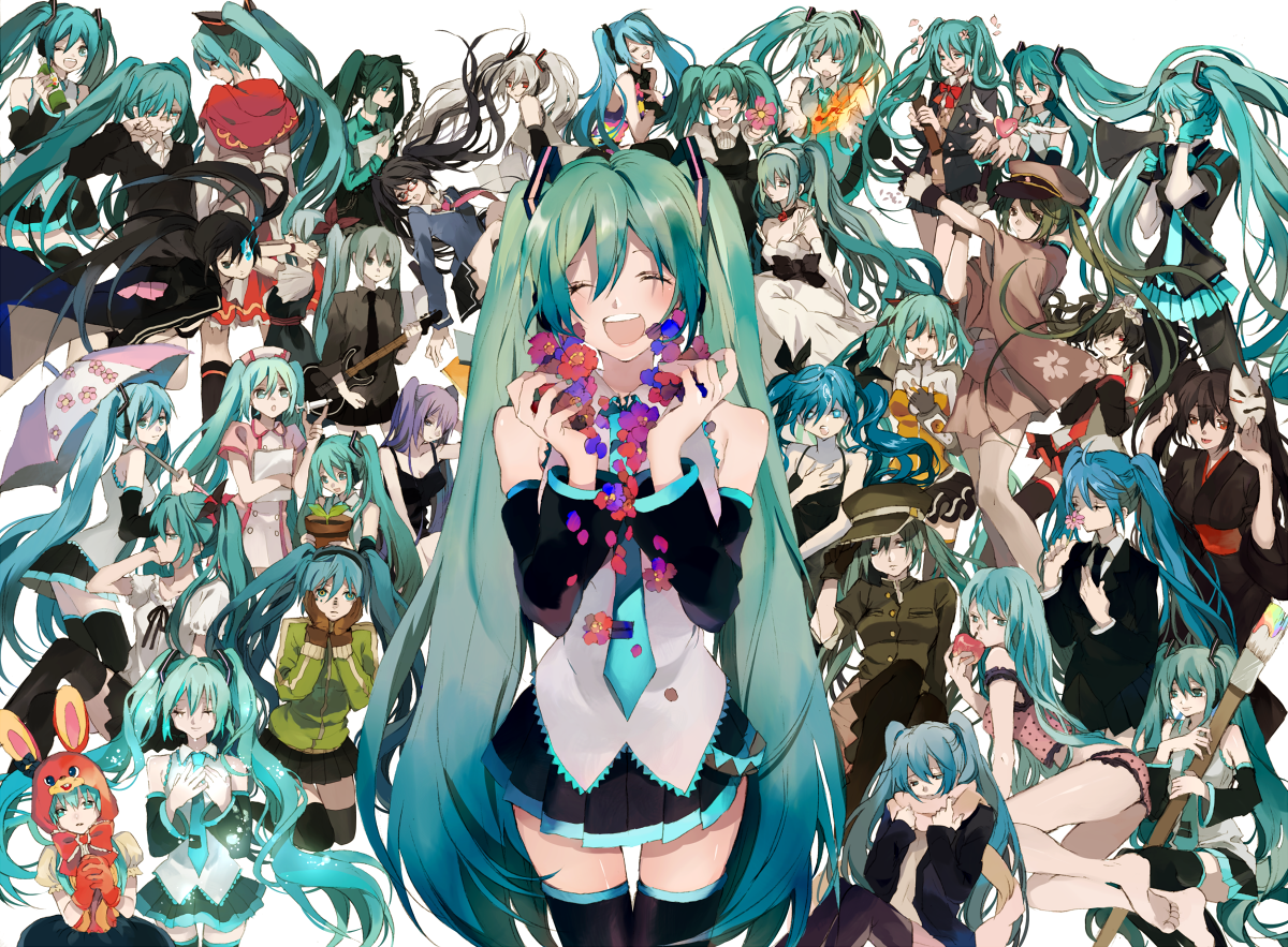 10s 1925_(vocaloid) 6+girls aqua_necktie bad_end_night_(vocaloid) bare_shoulders black_legwear black_rock_shooter black_rock_shooter_(character) black_skirt cendrillon_(vocaloid) clock_lock_works_(vocaloid) collared_shirt detached_sleeves electric_angel_(vocaloid) everyone flower hatsune_miku hatsune_miku_(conductor_nightingale) hatsune_miku_(heartbeat) hatsune_miku_(saihate) hatsune_miku_(supreme) hatsune_miku_(violet_butterfly) hatsune_miku_no_shoushitsu_(vocaloid) hello_planet_(vocaloid) karakuri_pierrot_(vocaloid) koi_wa_sensou_(vocaloid) koiiro_byoutou_(vocaloid) lol_-lots_of_laugh-_(vocaloid) long_hair matryoshka_(vocaloid) monochro_blue_sky_(vocaloid) multiple_girls musunde_hiraite_rasetsu_to_mukuro_(vocaloid) necktie nisoku_hokou_(vocaloid) odds_&_ends_(vocaloid) rolling_girl_(vocaloid) romeo_to_cinderella_(vocaloid) saihate_(vocaloid) sakura_no_ame_(vocaloid) senbon-zakura_(vocaloid) shinkai_shoujo_(vocaloid) shirt simple_background skirt sleeveless sleeveless_shirt smelling smelling_flower songover standing tell_your_world_(vocaloid) thighhighs too_many tsukioka_tsukiho very_long_hair vocaloid voice_(vocaloid) white_background world_is_mine_(vocaloid) zettai_ryouiki