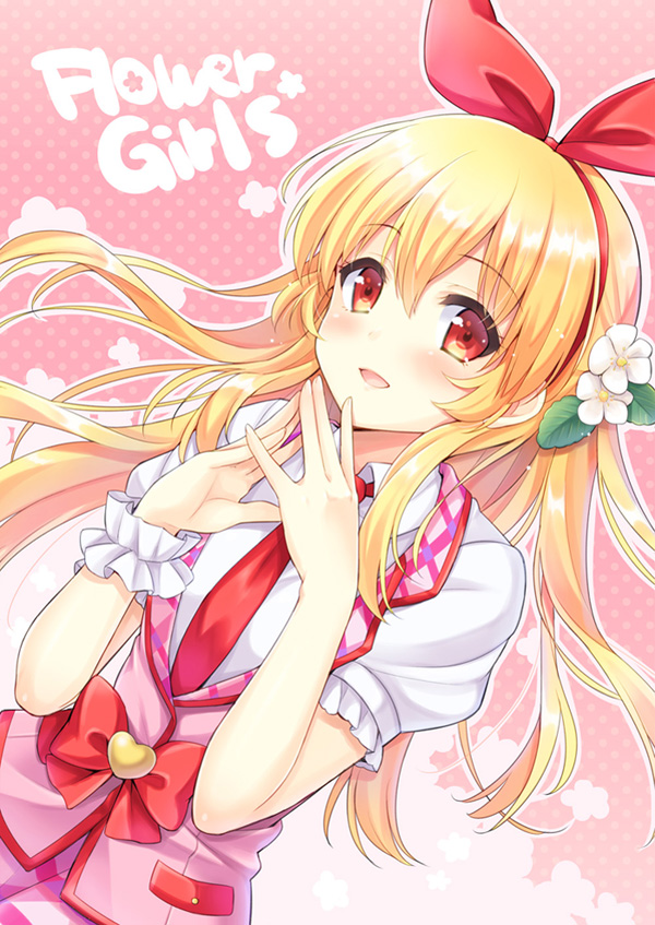 10s 1girl :d aikatsu! aikatsu!_(series) blonde_hair bow courreges_ace english_text female_focus flower hair_flower hair_ornament hair_ribbon hoshimiya_ichigo leaf long_hair necktie open_mouth red_eyes ribbon scrunchie smile solo steepled_fingers