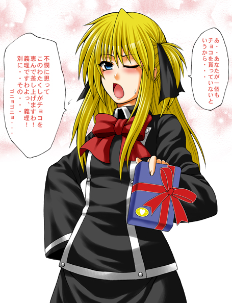 1girl female_focus gift holding holding_gift incoming_gift quiz_magic_academy shalon solo taihei_tengoku translated tsundere valentine