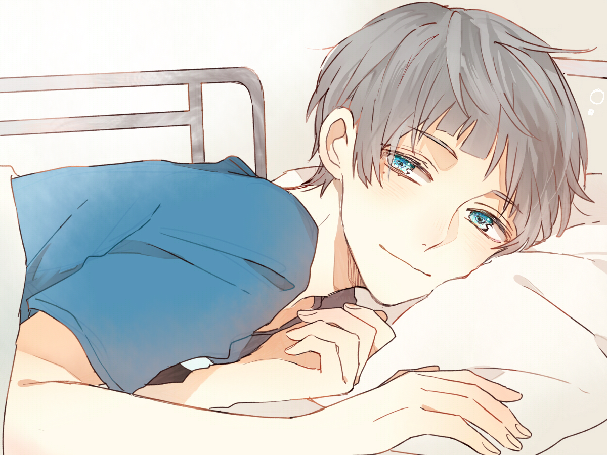 10s 1boy blue_eyes free! grey_hair kanata_(anpan-ya) male_focus mole mole_under_eye nitori_aiichirou shijima_tohiro short_hair smile solo under_covers
