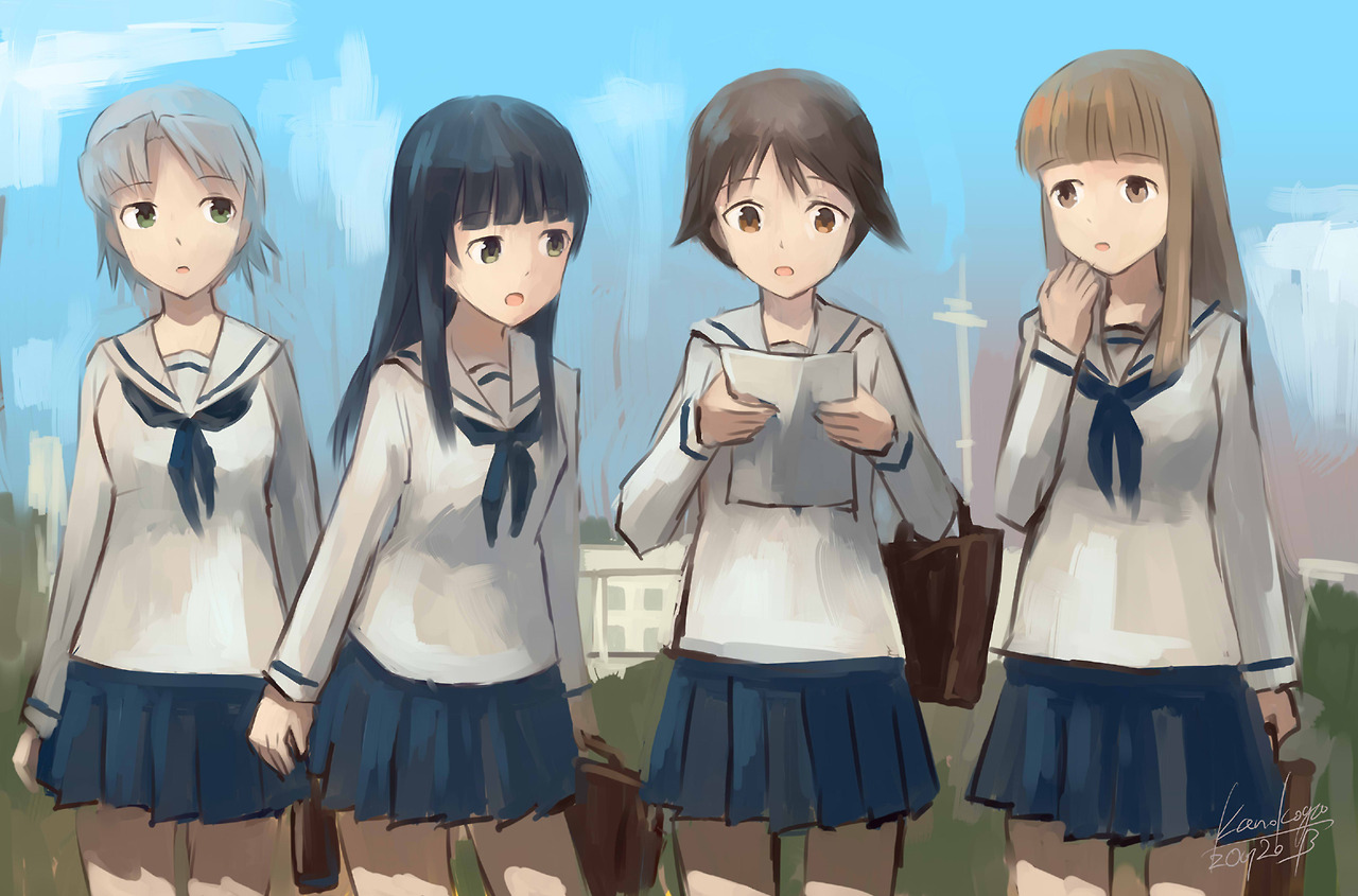 4girls alternate_costume artist_name bag black_hair brown_eyes brown_hair dated green_eyes kanokoga long_hair miyafuji_yoshika multiple_girls nakajima_hayate paper reading school_bag school_uniform serafuku short_hair silver_hair skirt strike_witches suwa_goshiki tenkuu_no_otome-tachi world_witches_series yamakawa_michiko