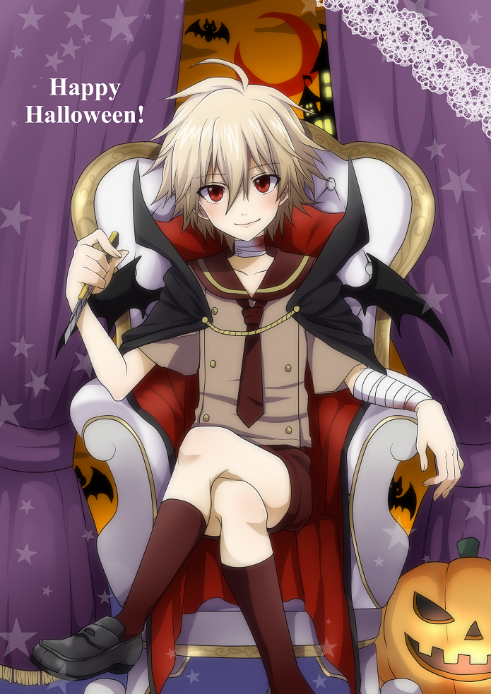 1boy aged_down blush boxcutter cape child crossed_legs grey_hair halloween happy_halloween jack-o'-lantern kneehighs knife male_focus nagisa_kaworu neon_genesis_evangelion pumpkin red_eyes red_socks short_hair shorts sitting smile socks solo usagigenki wings