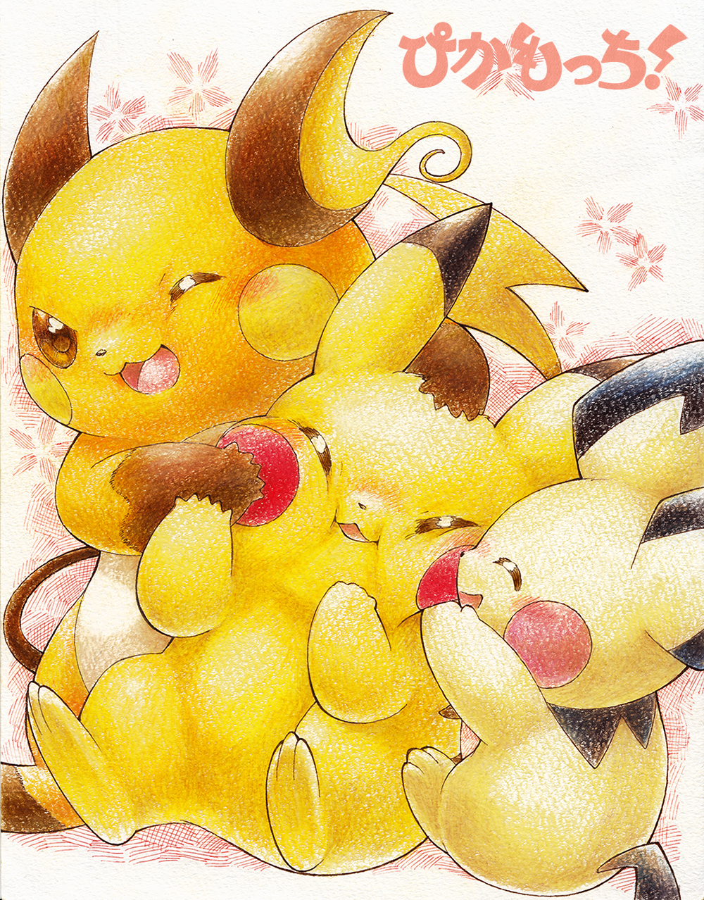 ;d ^_^ bad_id bad_pixiv_id blush brown_eyes cheek_squash closed_eyes evolutionary_line gen_1_pokemon gen_2_pokemon hand_on_head highres nintendo no_humans one_eye_closed open_mouth pichu pikachu pokemon pokemon_(creature) raichu sitting smile tail toitoi508 wink