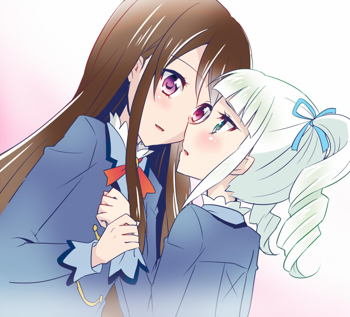 10s 2girls aikatsu! aikatsu!_(series) arm_grab bad_id bad_pixiv_id blonde_hair blush brown_hair drill_hair eye_contact female_focus hair_ribbon holding_another's_wrist imminent_kiss long_hair looking_at_another multiple_girls open_mouth purple_eyes ribbon school_uniform shibuki_ran todo_yurika twin_drills yuri yuu_(derodero)