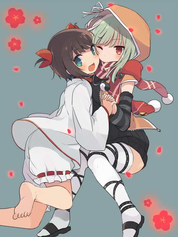 10s 2girls ankle_lace-up bad_id bad_pixiv_id barefoot bloomers brown_eyes brown_hair cheek-to-cheek green_eyes green_hair heads_together holding_hands hood kagura_(senran_kagura) mizuki_(koko_lost) multiple_girls naraku_(senran_kagura) one_eye_closed ribbon-trimmed_underwear ribbon_trim sandals scarf scarf_over_mouth senran_kagura short_hair soles thighhighs underwear white_legwear wink