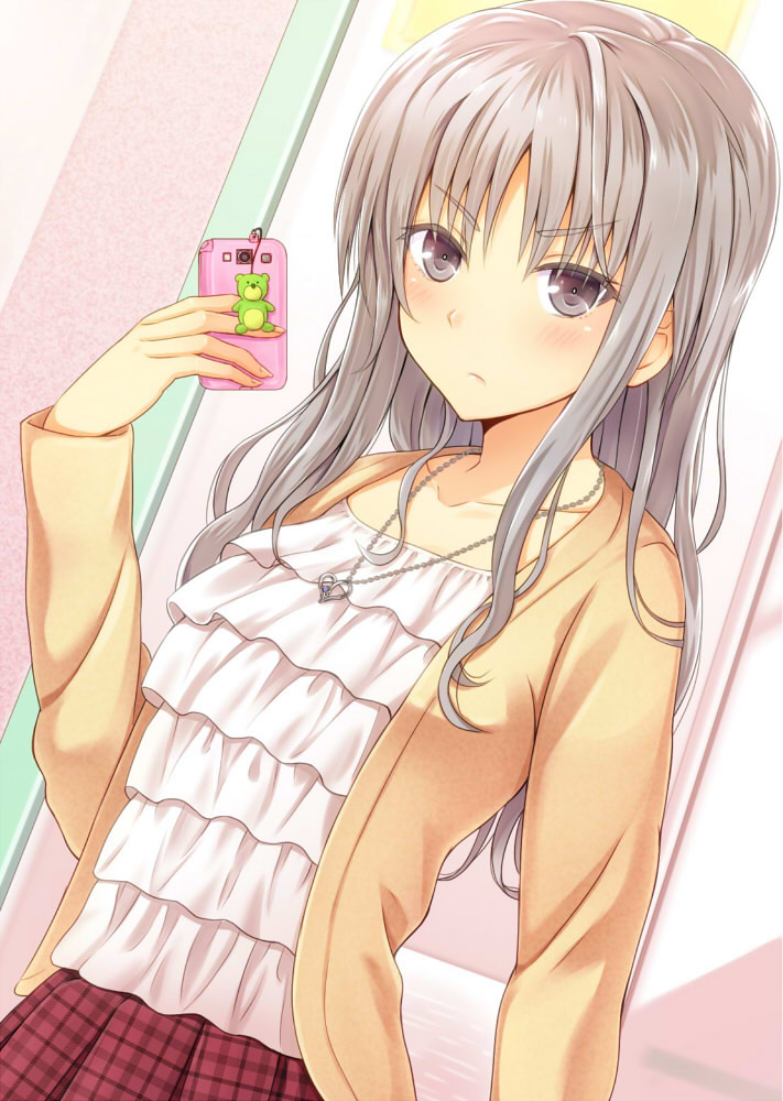 >:( 1girl blush camera_phone cellphone cellphone_strap collarbone dutch_angle female_focus frown grey_eyes hand_up holding holding_phone jacket jewelry kanden_sky layered_clothes long_hair long_sleeves looking_at_viewer necklace original phone plaid_clothes plaid_skirt pleated_skirt silver_hair skirt solo v-shaped_eyebrows wavy_hair