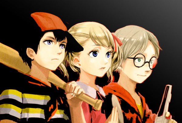 1girl 2boys ana_(mother) backwards_hat baseball_bat baseball_cap black_background black_hair blonde_hair blue_eyes brown_eyes chickenb child dress freckles glasses hat lloyd_(mother) mother_(series) mother_1 multiple_boys neckerchief ninten nintendo realistic ribbon sassa_(cb) shirt simple_background striped_clothes striped_shirt twintails white_hair